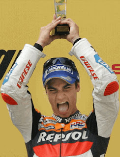 EL Domingo en Estoril se disputa una nueva carrera de Moto GP, los grandes favoritos son Casey Stoner y Valentino Rossi pero el Blog de APUESTAS LOCAS apuesta por el Catalán Dani Pedrosa como ganador de la cursa de la categoria reina. Pedrosa que ocupa la tercera posición en la clasificación general de Moto GP llega a Estoril con ganas de hacer algo grande después de la caida en la pasada carrera...Así que apostamos por Pedrosa como ganador en Portugal a una cuota en Betfair de 9.4€...Si apostamos 10 euros y el piloto de repsol honda gana podemos ganar 94€. No ibamos mal encaminados al apostar por el cataán en esta nueva APUESTA LOCA, Valentino Rossi y Dani Pedrosa han protagonizado un duelo estelar que finalmente se ha decantado para el italiano. Los 94€ han estado muy cerca.